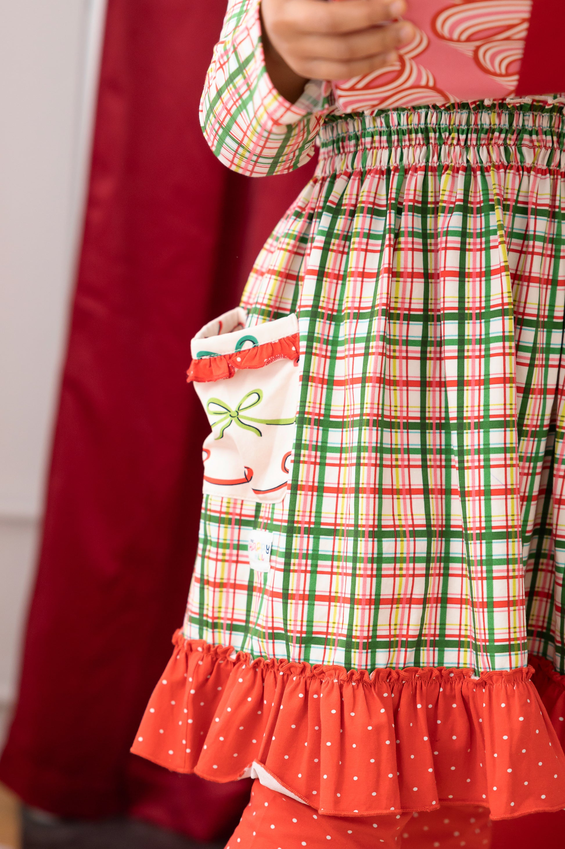 Timeless holiday charm meets playful details in our Deck the Halls Dress! Featuring a classic plaid pattern accented with vibrant red polka dot trim, this dress is a festive favorite. Adorable bow-accented pockets add a touch of whimsy, while the twirl-worthy skirt makes it perfect for dancing through holiday celebrations. Crafted from soft, high-quality fabric, this dress ensures both comfort and style for your little one’s special moments!