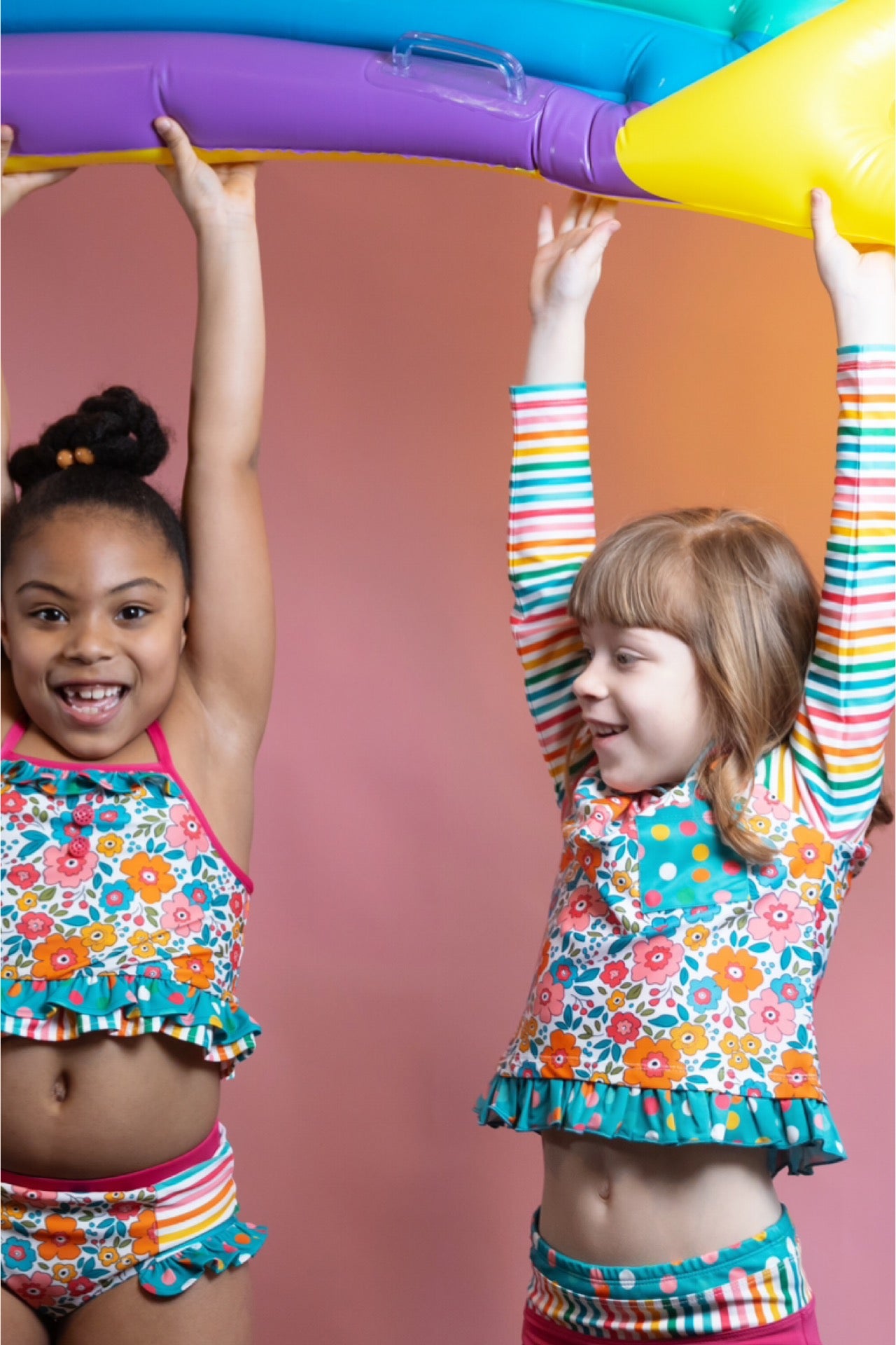 Our Fun in the Sun Floral Rashguard is a must-have for all-day fun in the sun! Featuring a beautiful floral print, our signature Happy Striped sleeves, a playful multi-colored polka dot pocket, and a stylish quarter zipper, this rashguard is as cute as it is functional.