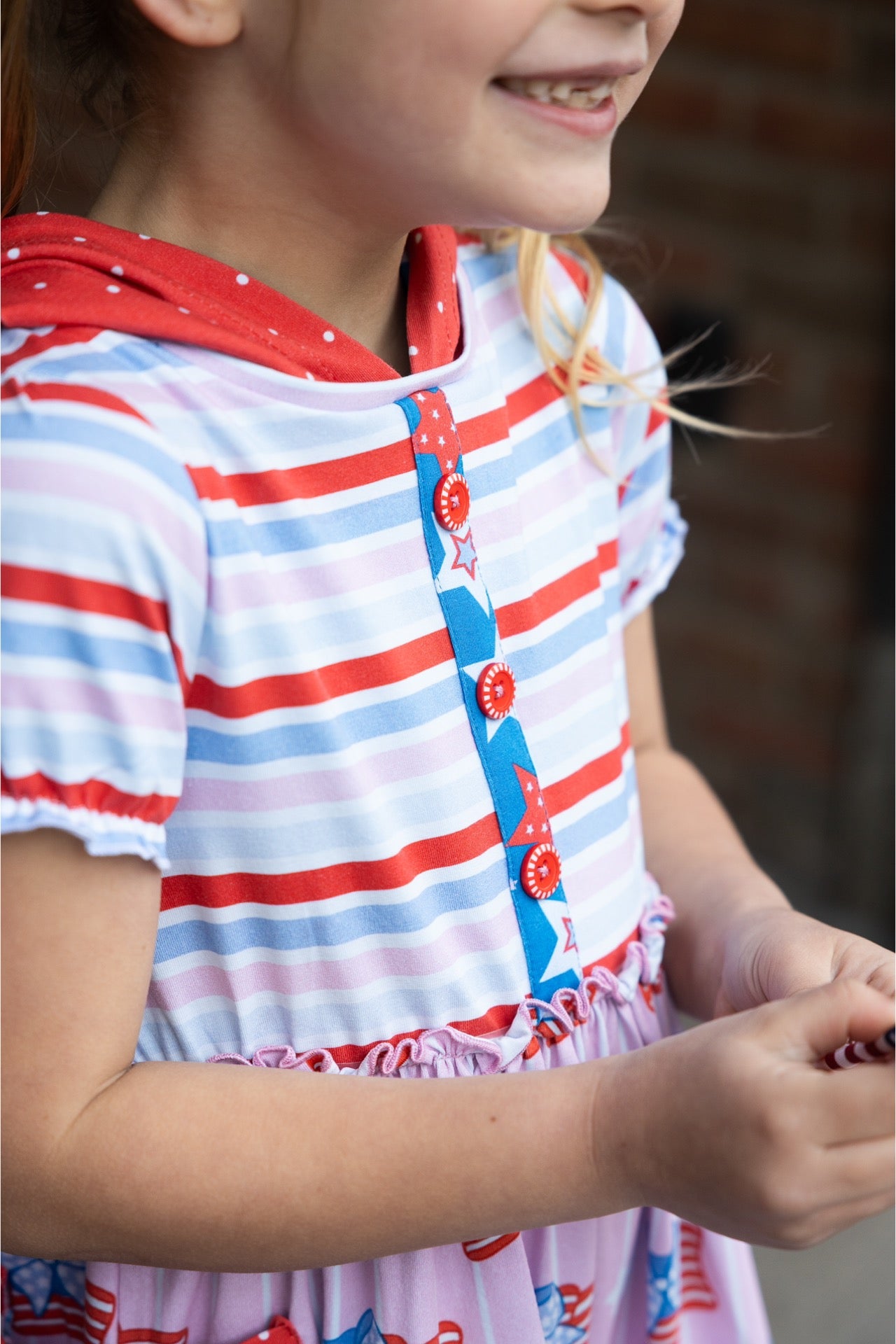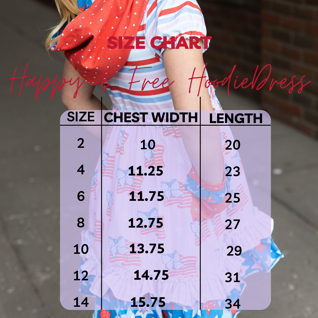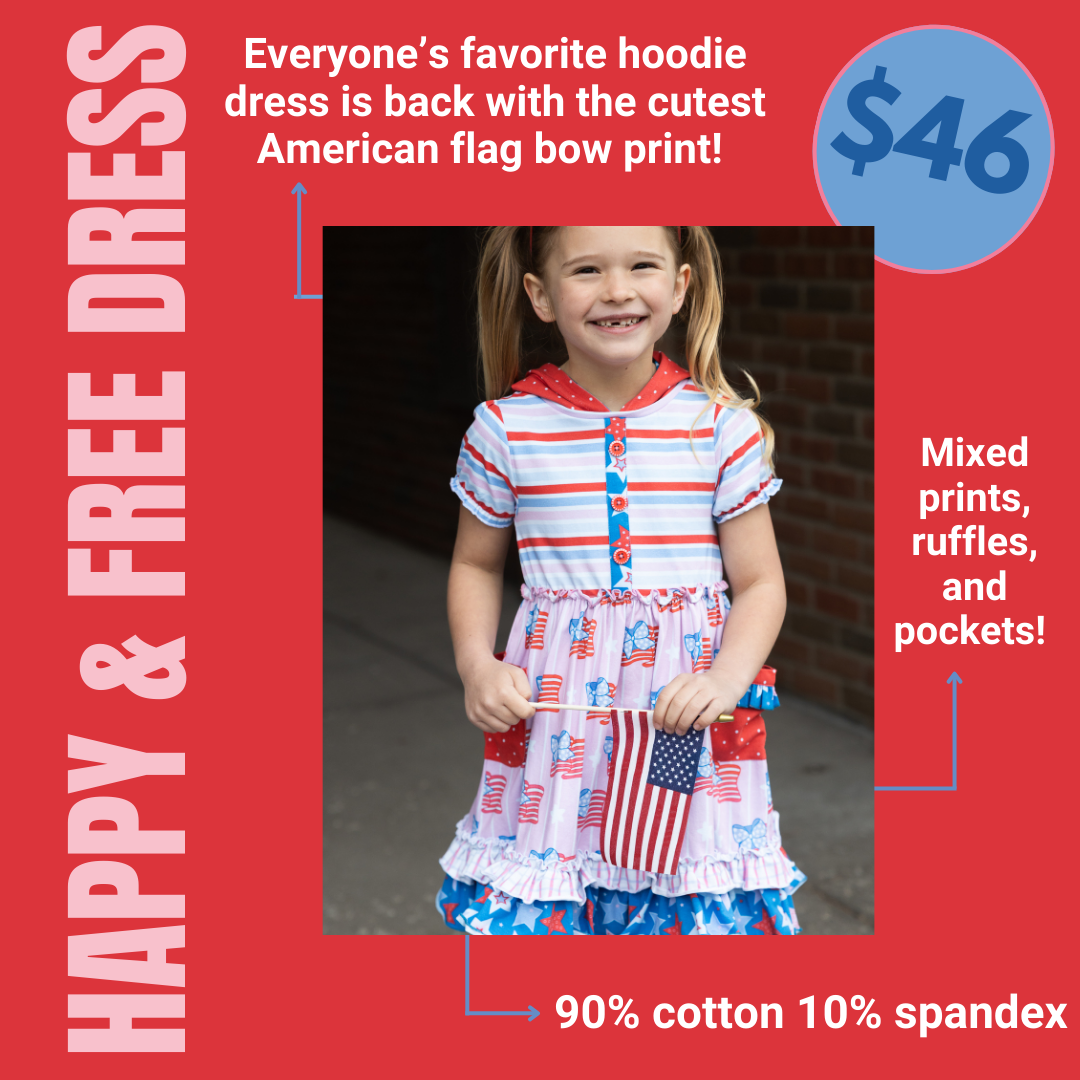 Bursting with red, white, and so much cute, the Happy & Free Dress is made for little firecrackers who shine bright and twirl big! This patriotic piece features cheerful stripes, star-spangled pockets, and a fluttery skirt adorned with ruffles and bold prints that celebrate all things stars and stripes. With its comfy knit fabric, pop-color buttons, and playful hood detail, it’s perfect for parades, BBQs, or any day she feels like showing off her sparkle!