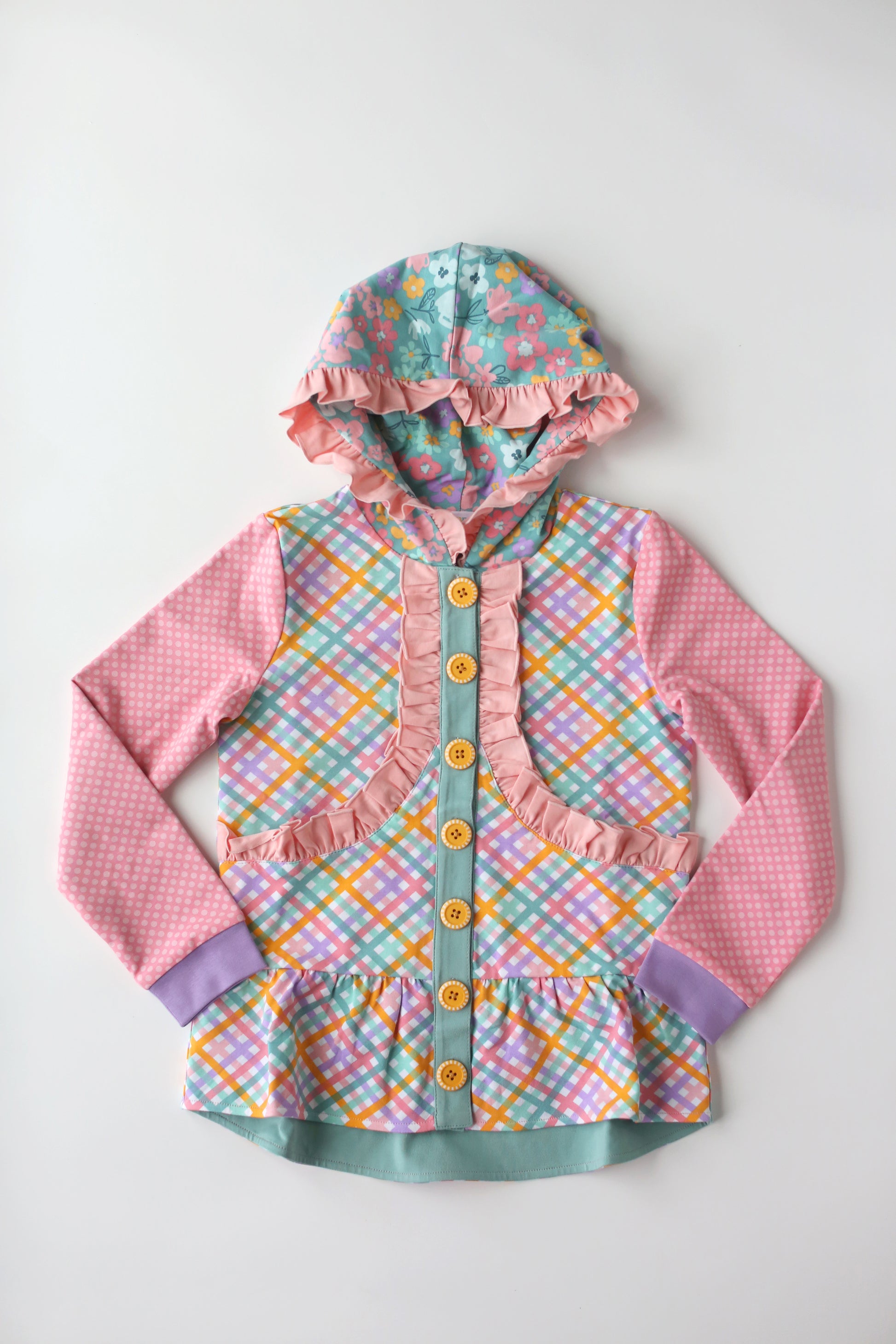 Nothing says springtime charm quite like our Pastel Picnic Hoodie-a vibrant pastel gingham hoodie with the most perfect ruffle detail. Perfect for cool spring days or breezy summer evenings, this hoodie is a must have addition to any little girl's wardrobe.