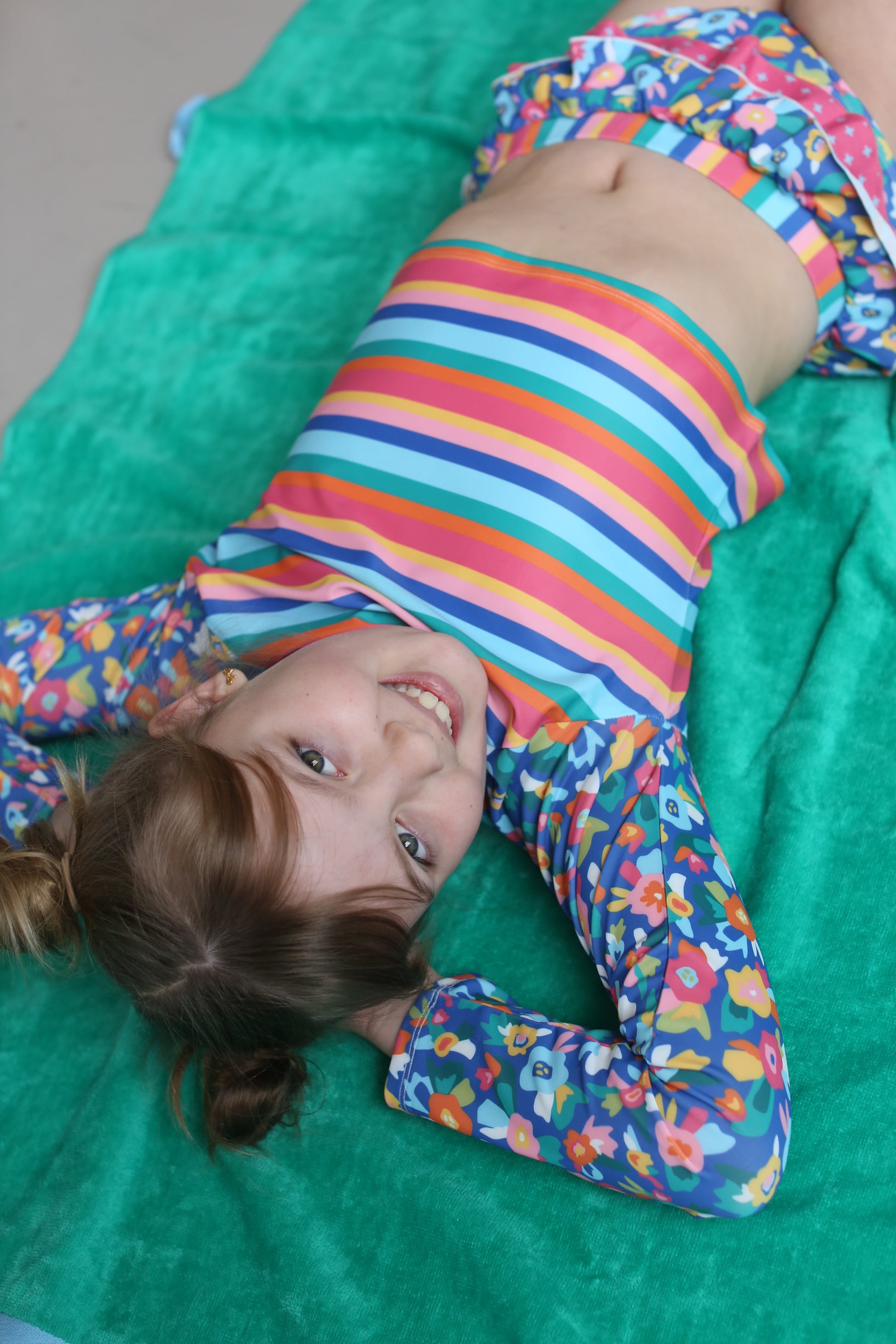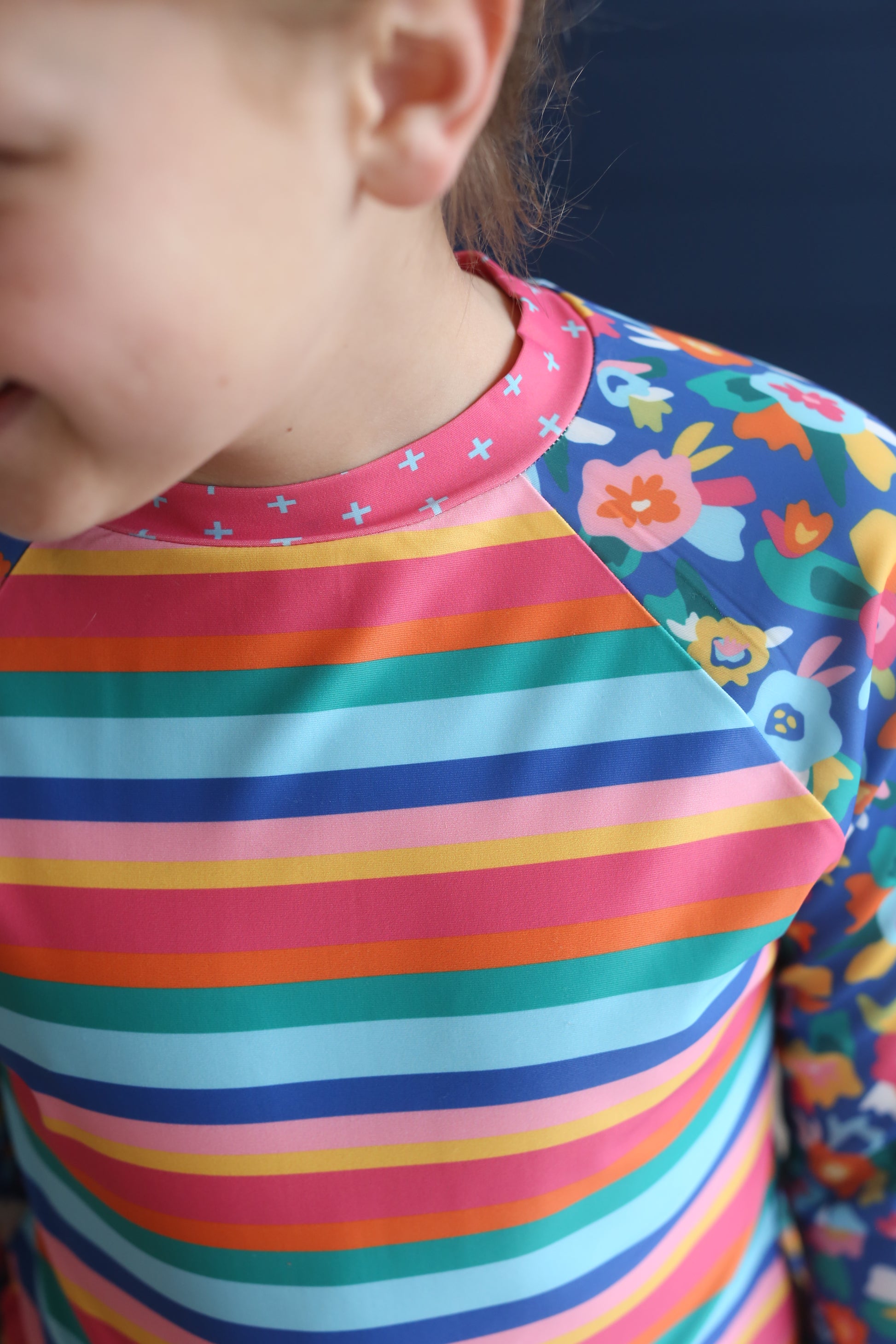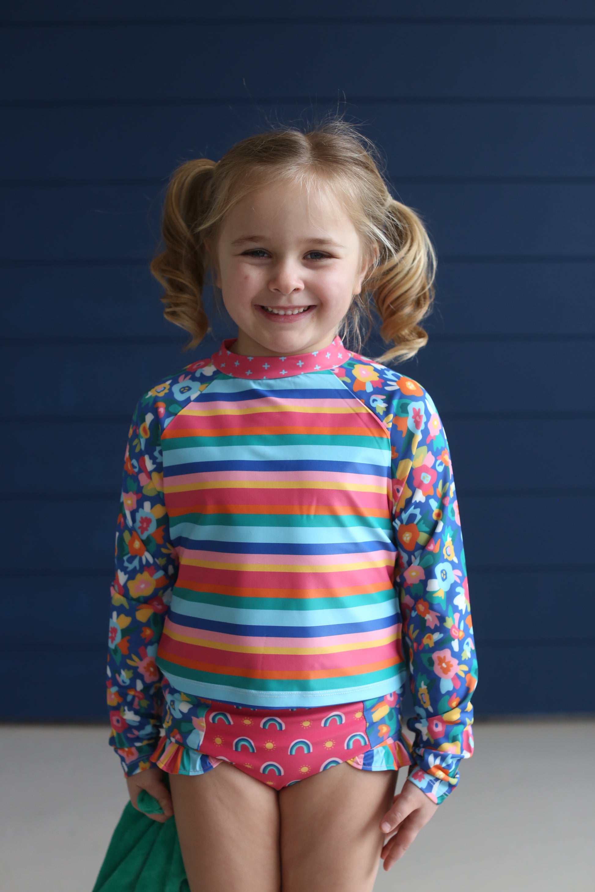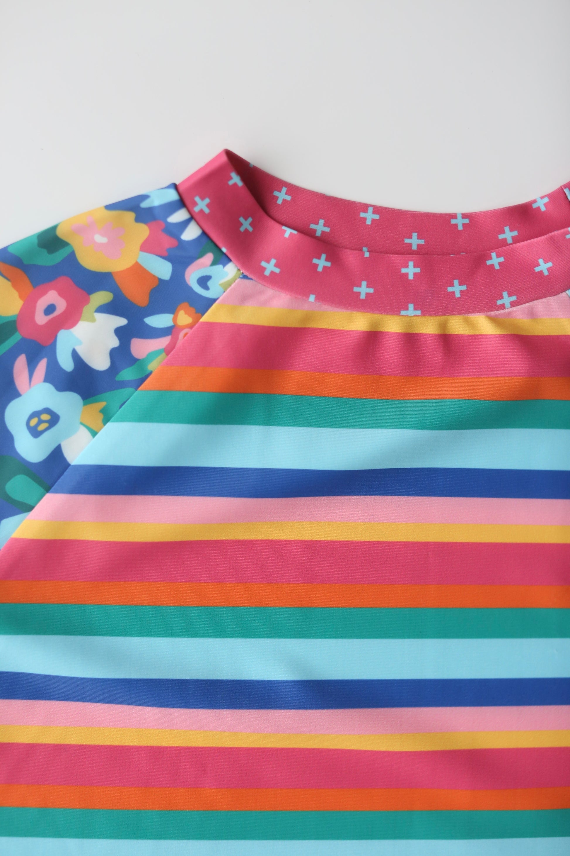 Introducing our vibrant and playful Riptide Rashguard Suit! Embrace sunny days with our eye-catching rashguard featuring energetic striped sleeves and a burst of bright florals that bloom with every splash.