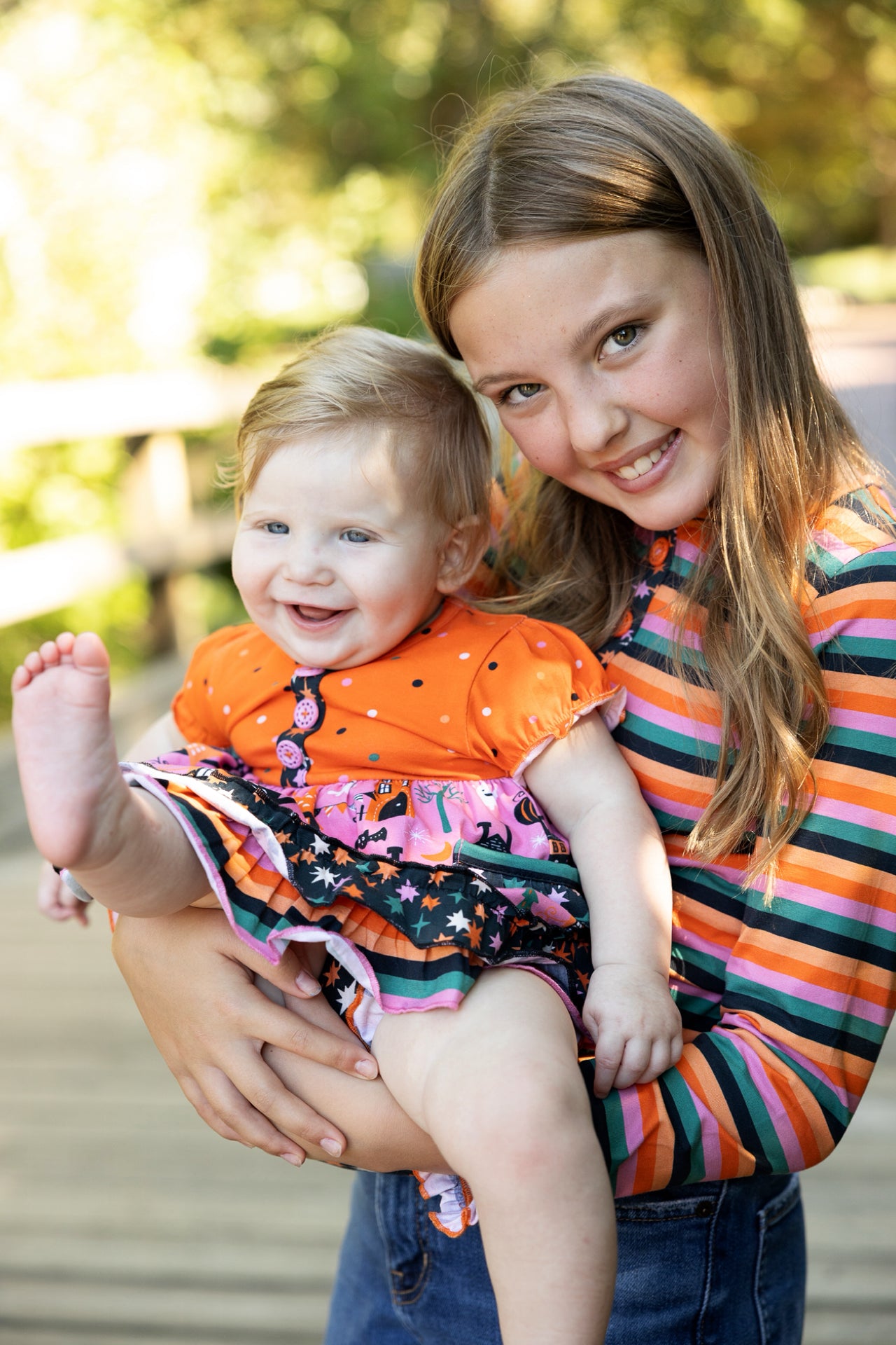 Classic stripes get a magical twist in the Spell Bound Striped Tee! With bold bands of orange, pink, teal, and black, this tee is full of festive fall charm. The star-printed placket and bright orange buttons add just the right pop of Halloween fun, making this top anything but basic.