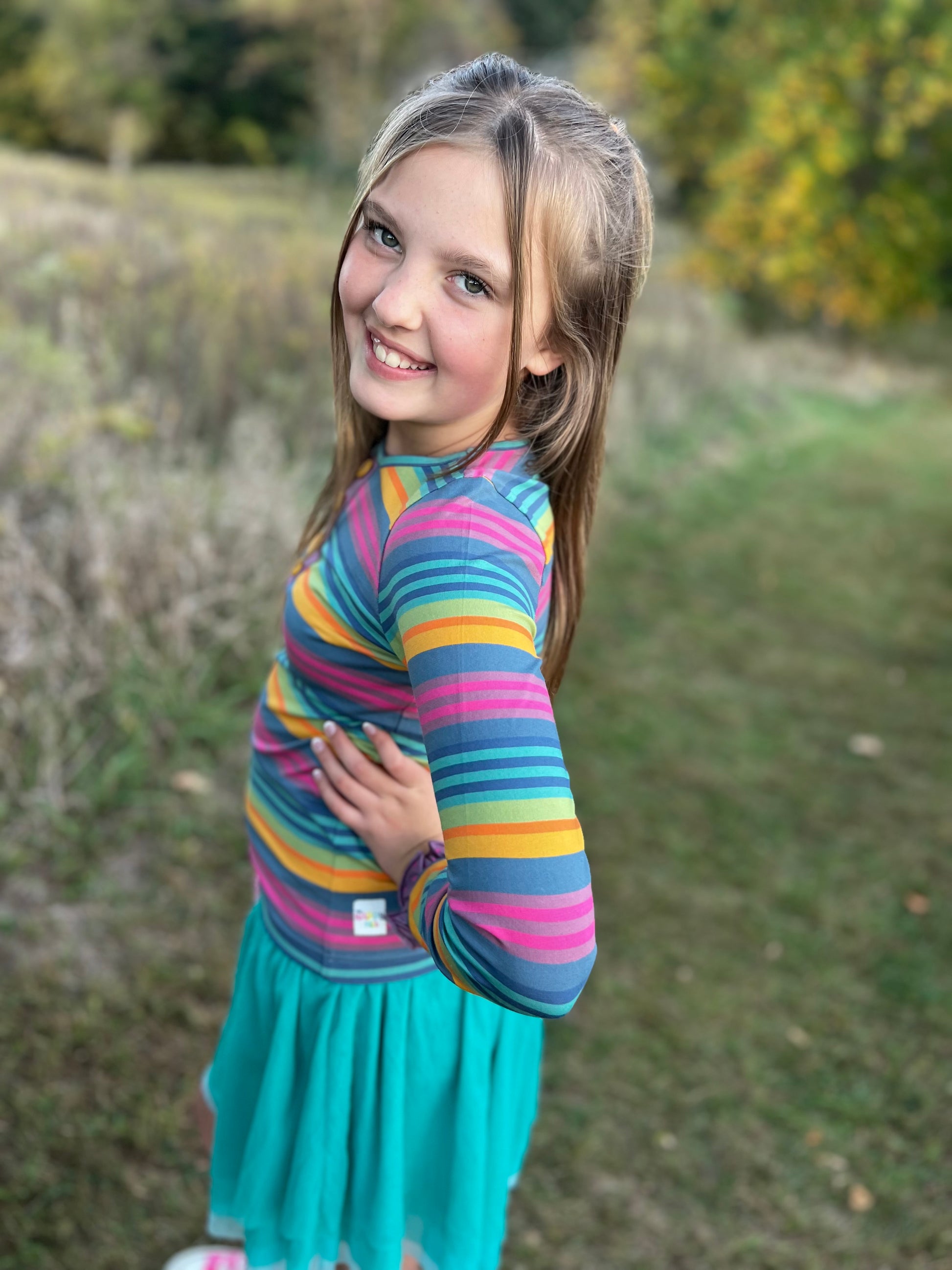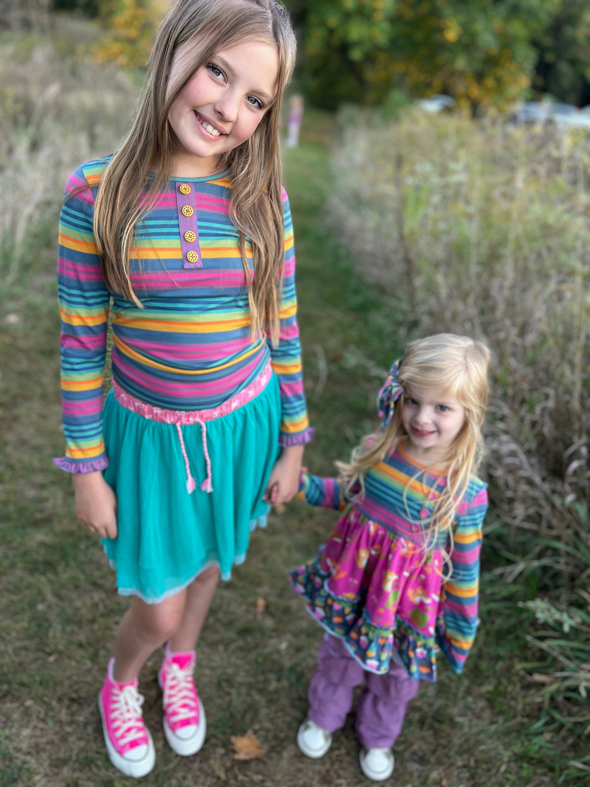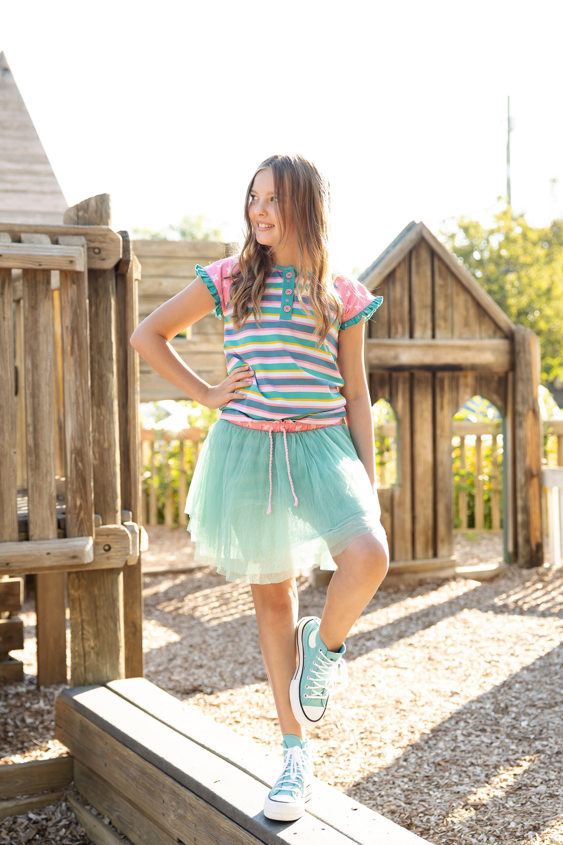 Straight out of a fairy tale! The Storybook Skirt layers soft, dreamy teal tulle for the perfect twirl, balanced with a stretchy pink waistband sprinkled in playful pink “x” details and finished with a braided pink tie. But here’s the happily-ever-after twist—striped shorts are hidden underneath, giving her all the freedom to run, climb, and spin without worry. Magical style meets everyday comfort, making this skirt a must-have for every little storyteller!