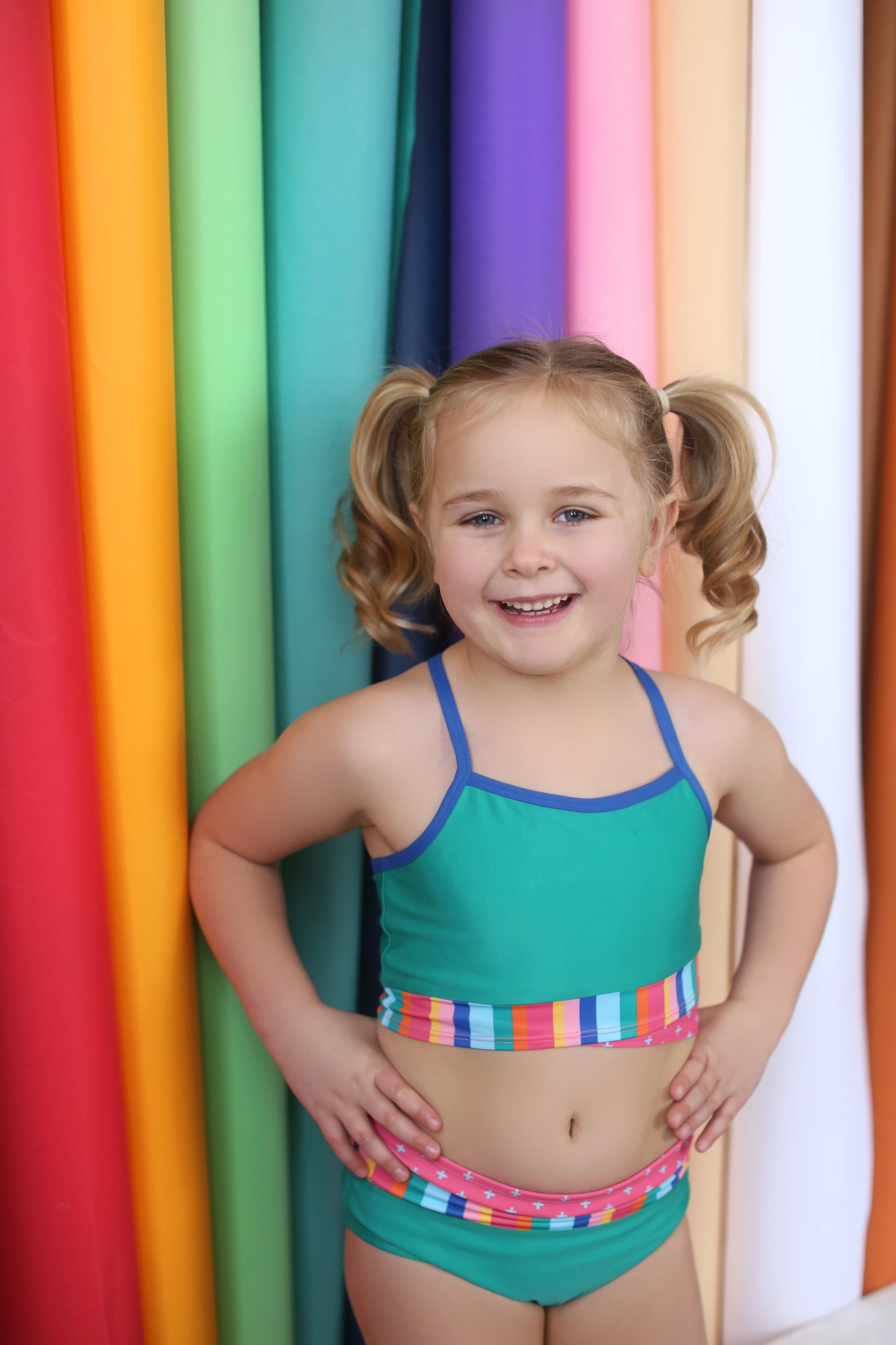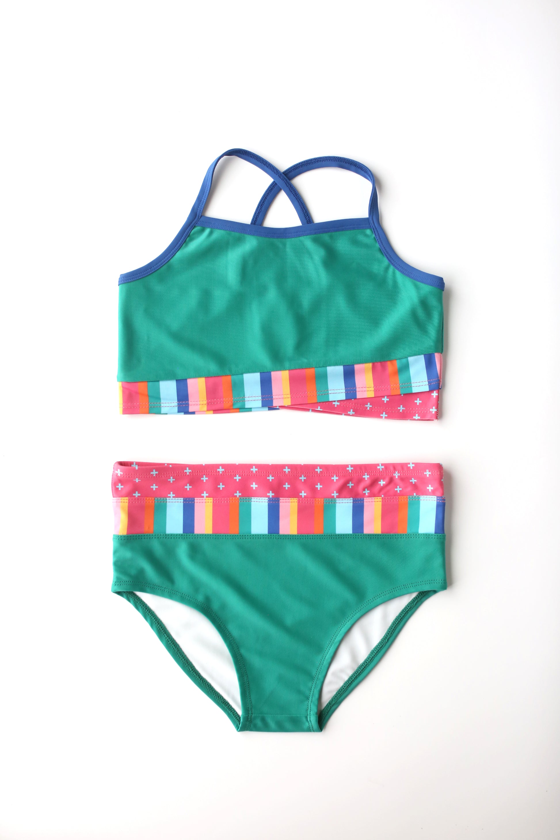 Introducing the Surf's Up Swimsuit-the perfect fusion of style and functionality for your active little ones. The gorgeous green hue of this suit is eye catching in and out of the water, while the playful rainbow stripes and bright pink plus signs add a splash of color and personality!