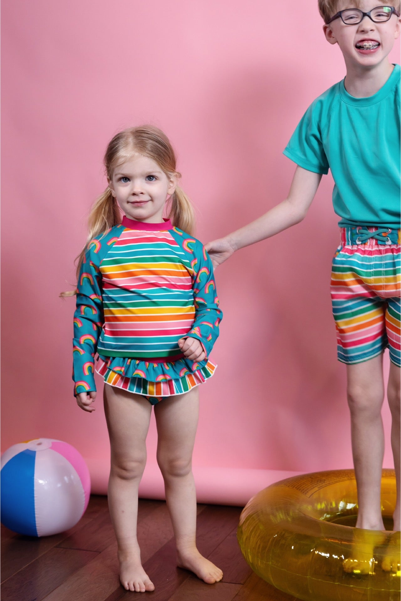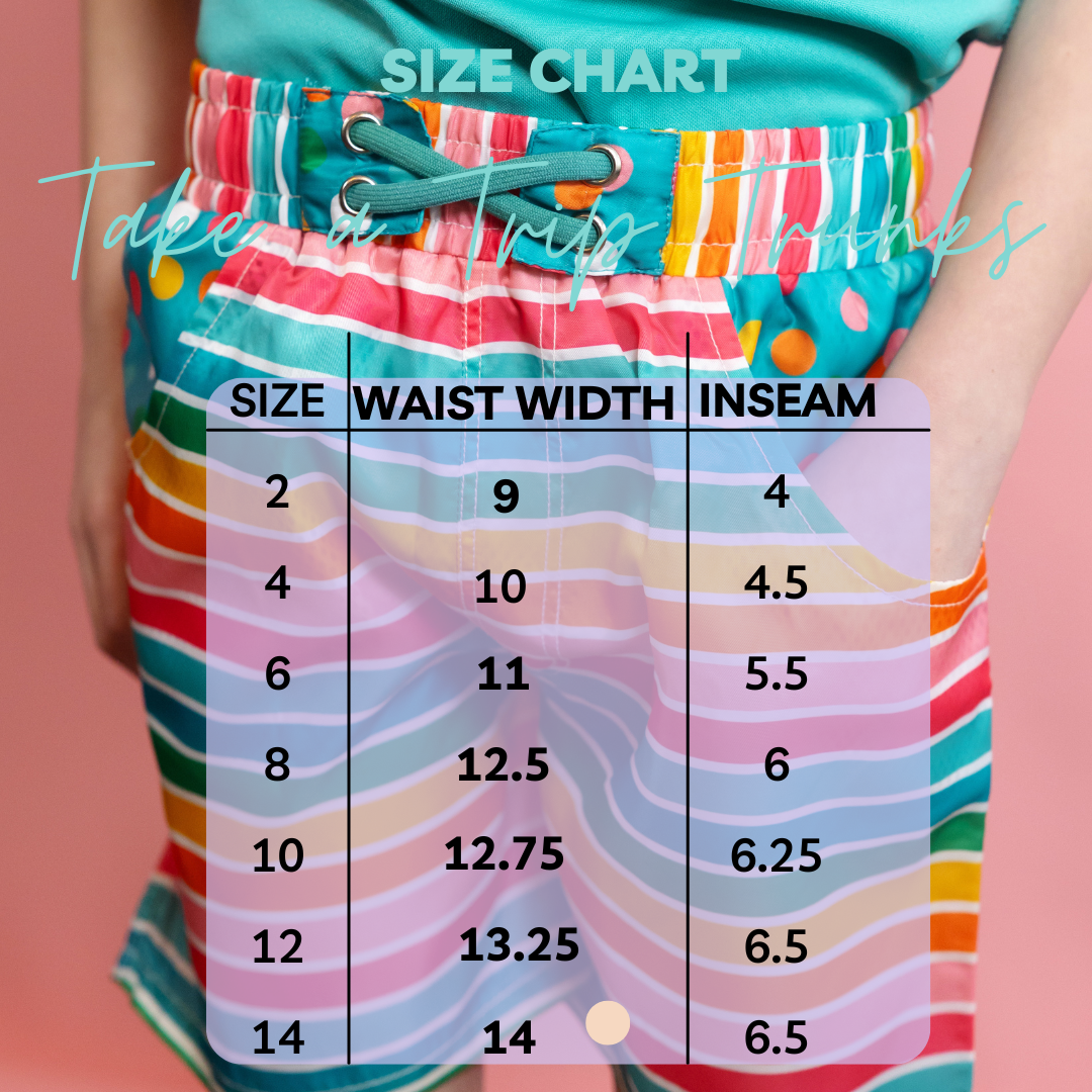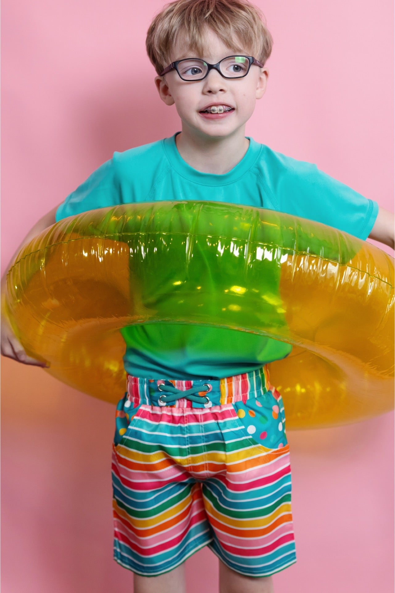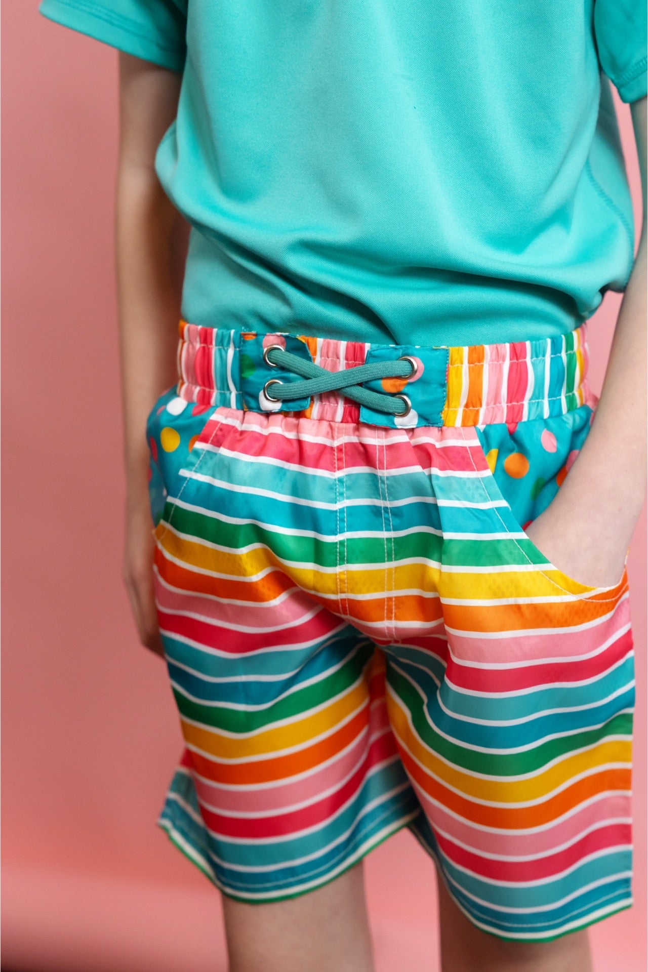 Our Take a Trip Trunks are made for adventure! Featuring our signature bright Happy Stripes and multi-colored polka dot pockets, these swim trunks bring all the fun to beach days, pool parties, and beyond. Plus, they coordinate perfectly with the entire Splash & Shine collection for the ultimate sibling and family matching moments!