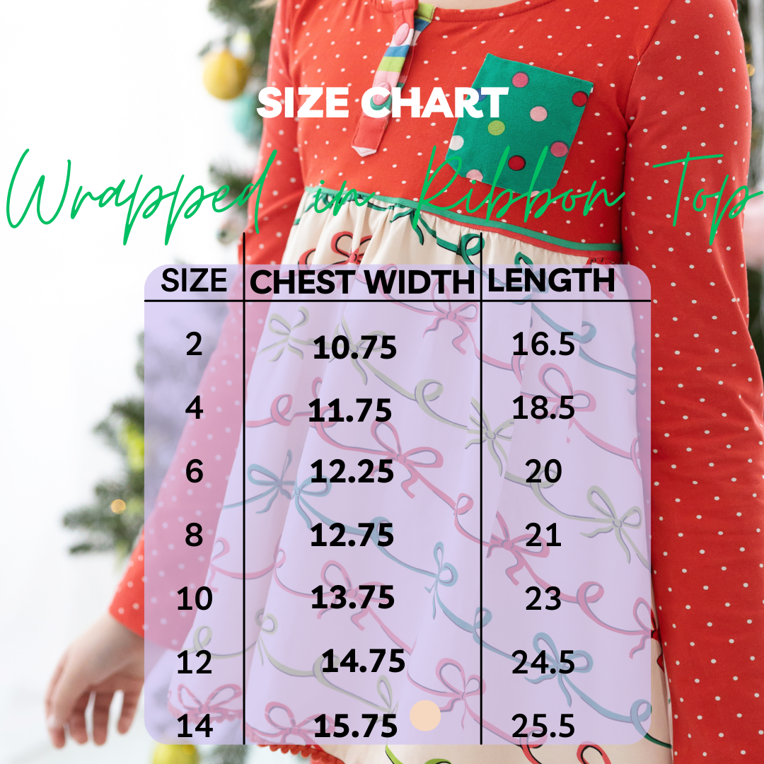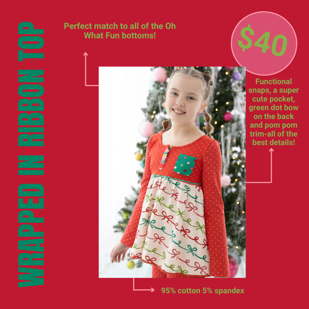 Our Wrapped in Ribbon tunic top features a playful design with red dots scattered across the top, and multicolored bows on the bottom, giving it a festive, fun vibe. This adorable top is adorned with a striped placard with easy-to-use pink snaps for comfort and style, while a green dot pocket and a cute bow accent on the back adds a pop of contrast. Perfect for holiday celebrations or everyday wear, this tunic combines both style and practicality. It coordinates perfectly with all of the bottoms from this collection!